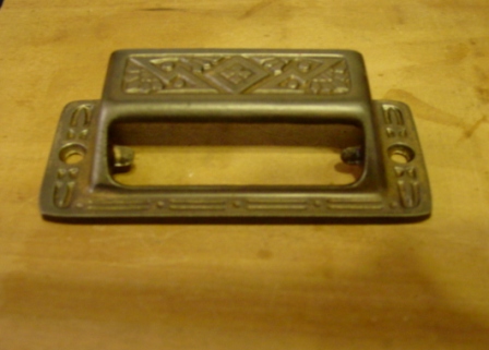 Cast Iron Bin Pulls 1 Available NOTE: Sale of this item is not complete until you receive a confirmation and shipping total from us. Victorian Cast Iron Bin Pulls. They measure 2 1/8" x 4 3/8", the hole centers measure 3 1/2". The Card size is 3/4" x 2 5/8". Restored and ready to be installed |