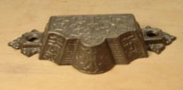 Victorian Cast Iron Bin Pull. It measures 2 1/4" x 4 7/8", the hole centers measure 4". The card size is 3/4" x 2 5/8". Restored and ready to be installed.