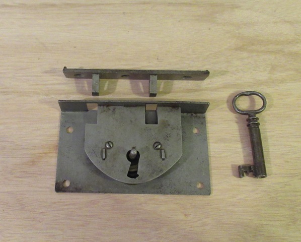Lock 1 Available NOTE: Sale of this item is not complete until you receive a confirmation and shipping total from us Cupboard or Drawer Locks are used on a Cupboard door or on a drawer. They are mounted on the inside of a cupboard or a drawer, facing (as the bottom one pictured) to the outside, a hole is cut to match the keyhole. The key hole center is 5/8" from top of lock to the pin, 5/8" from right side to pin and 1" from left to pin. It measures 2" from bolt edge to round edge x 1 3/4" wide. This lock must be installed in a dovetailed mortise (1 3/8" x 1 3/4" x 1/4"). The key handle may vary, restored and ready to be installed. |