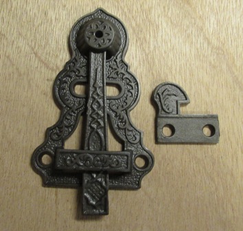 Victorian Cast Iron Thumb Latch, the handle mounts on one side of the door and measures 7 1/4" x 2 ". The bar assembly mounts on the other side of the door and measures with bar 2 3/4" x 5". All of the parts are original, and restored ready to be installed.